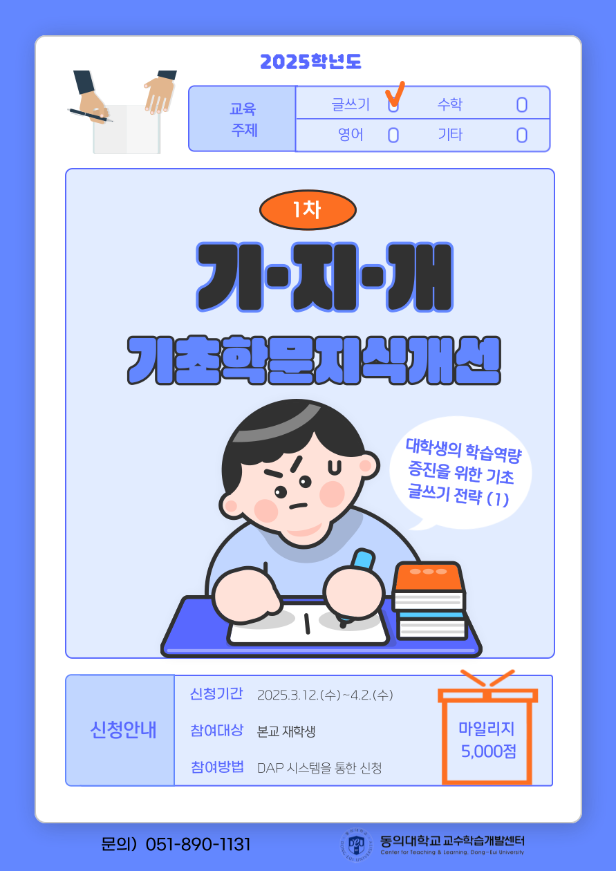 교수학습개발센터의 학습지원 프로그램인 2025학년도 기·지·개(기초학문 지식 개선) 1차를 다음과 같이 안내합니다.