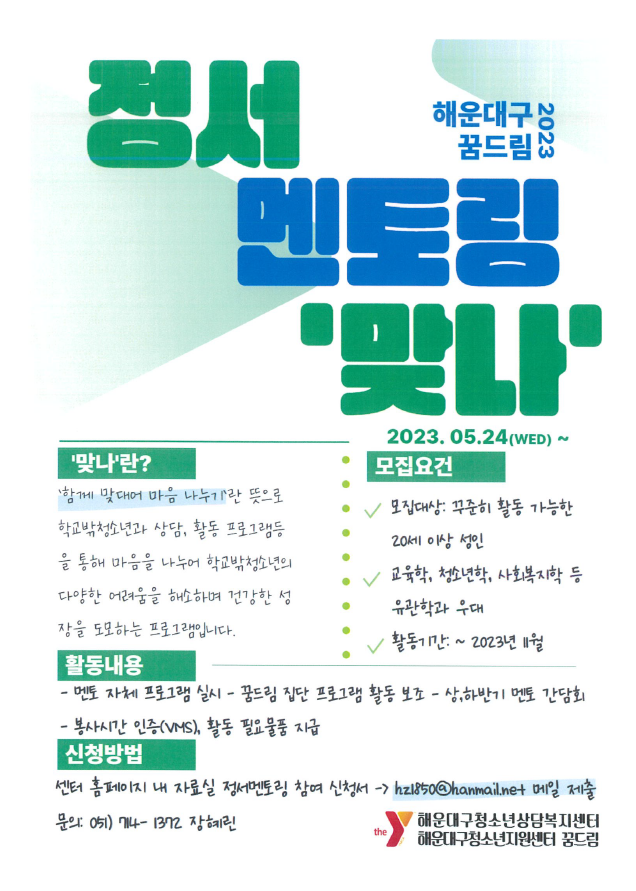 [모집] 2023년 해운대구학교밖청소년지원센터 <꿈드림 정서멘토단 '맞나'> 모집 안내