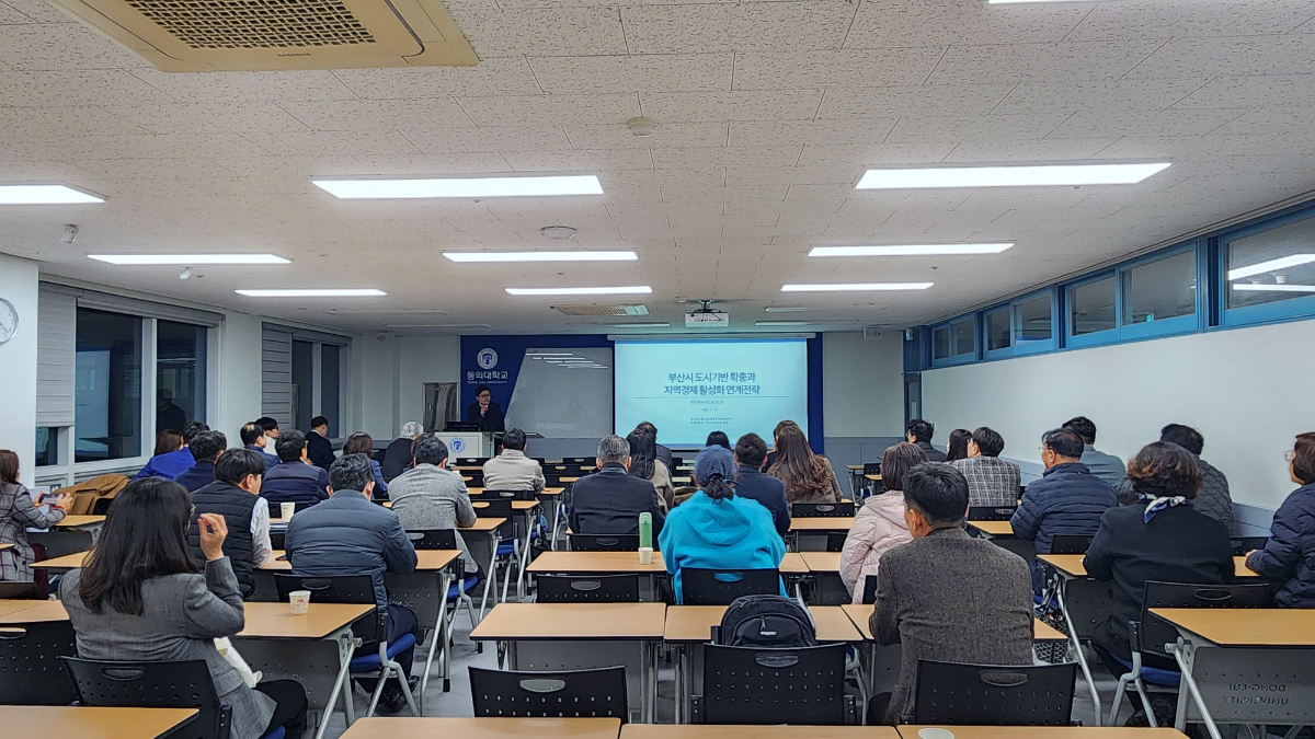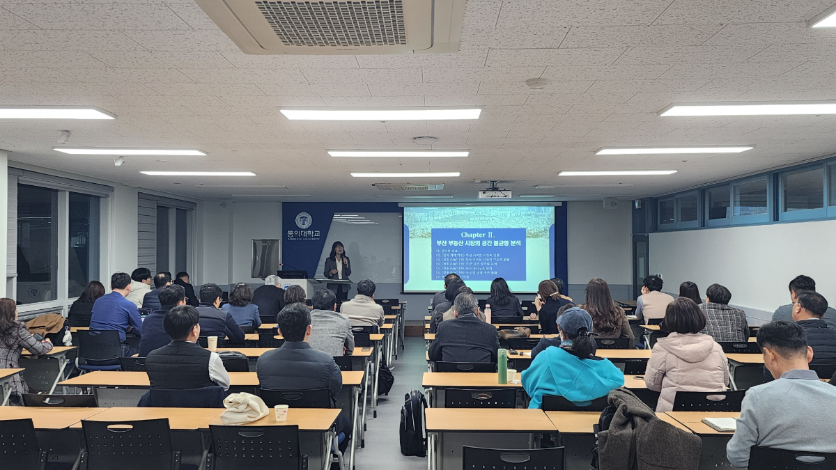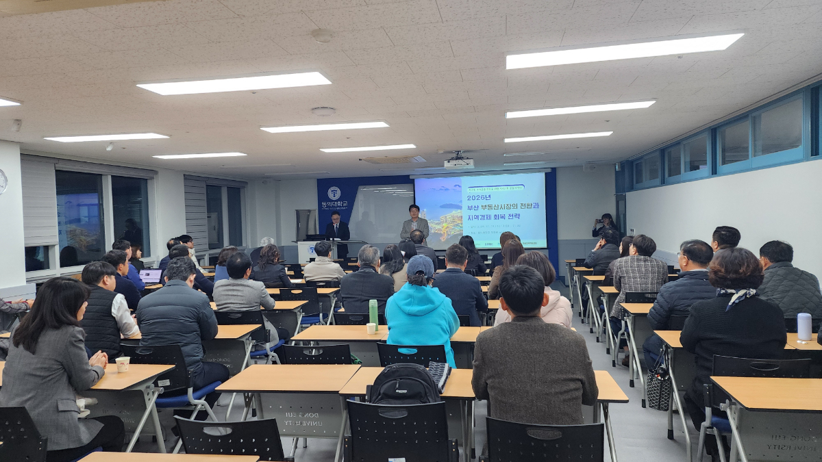 동의대학교 부동산대학원(원장 정쾌호)은 19일 가야캠퍼스 지천관에서 ‘2026년 부산 부동산시장의 전환과 지역경제 회복 전략’을 주제로 시민과 부동산대학원에 재학중인 석·박사가 참여하는 세미나를 개최했다.